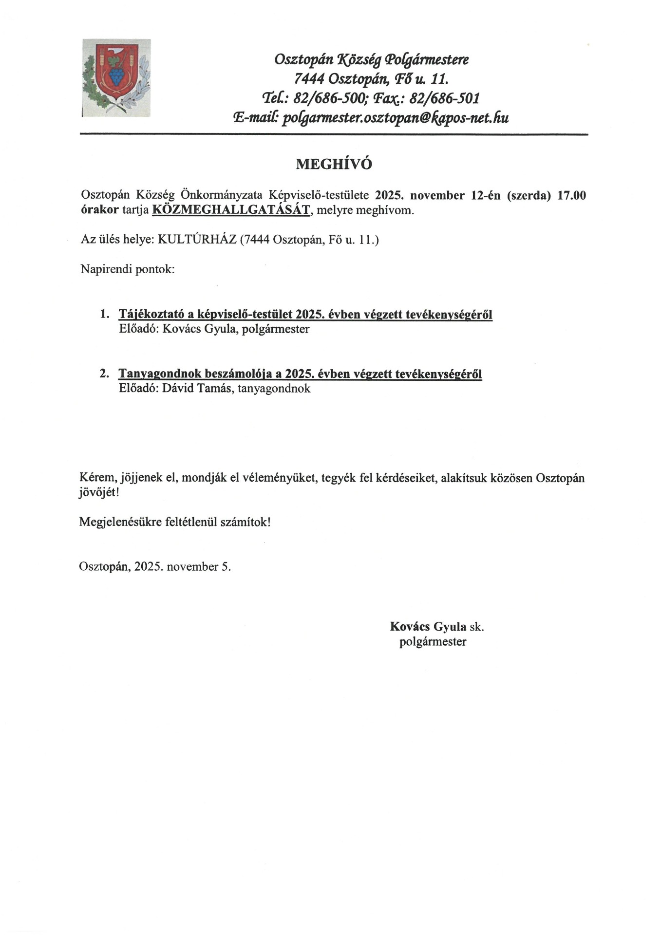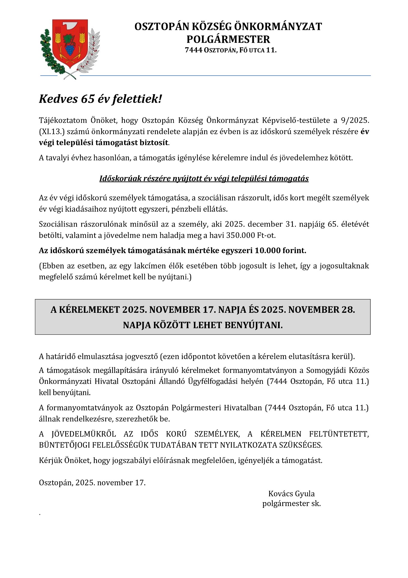 Kérem, hogy a kérelmeket a szükséges igazolásokkal együtt juttassák el az Osztopáni Polgármesteri Hivatalba.